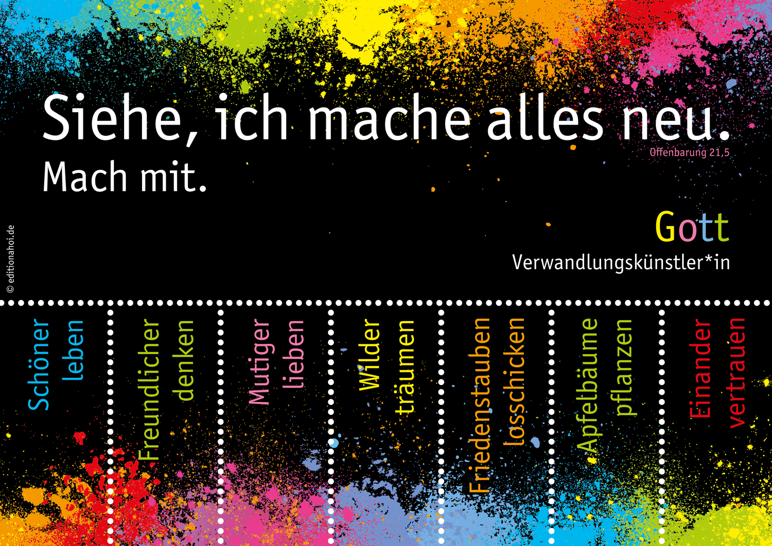 Die Jahreslosung 2026 gibt es als Postkarte, Klappkarte, Plakat und ganz neu: als besondere Geschenkkarte in DIN A5 mit einem vertiefenden Text auf der Innenseite. Alles in leuchtenden Farben.