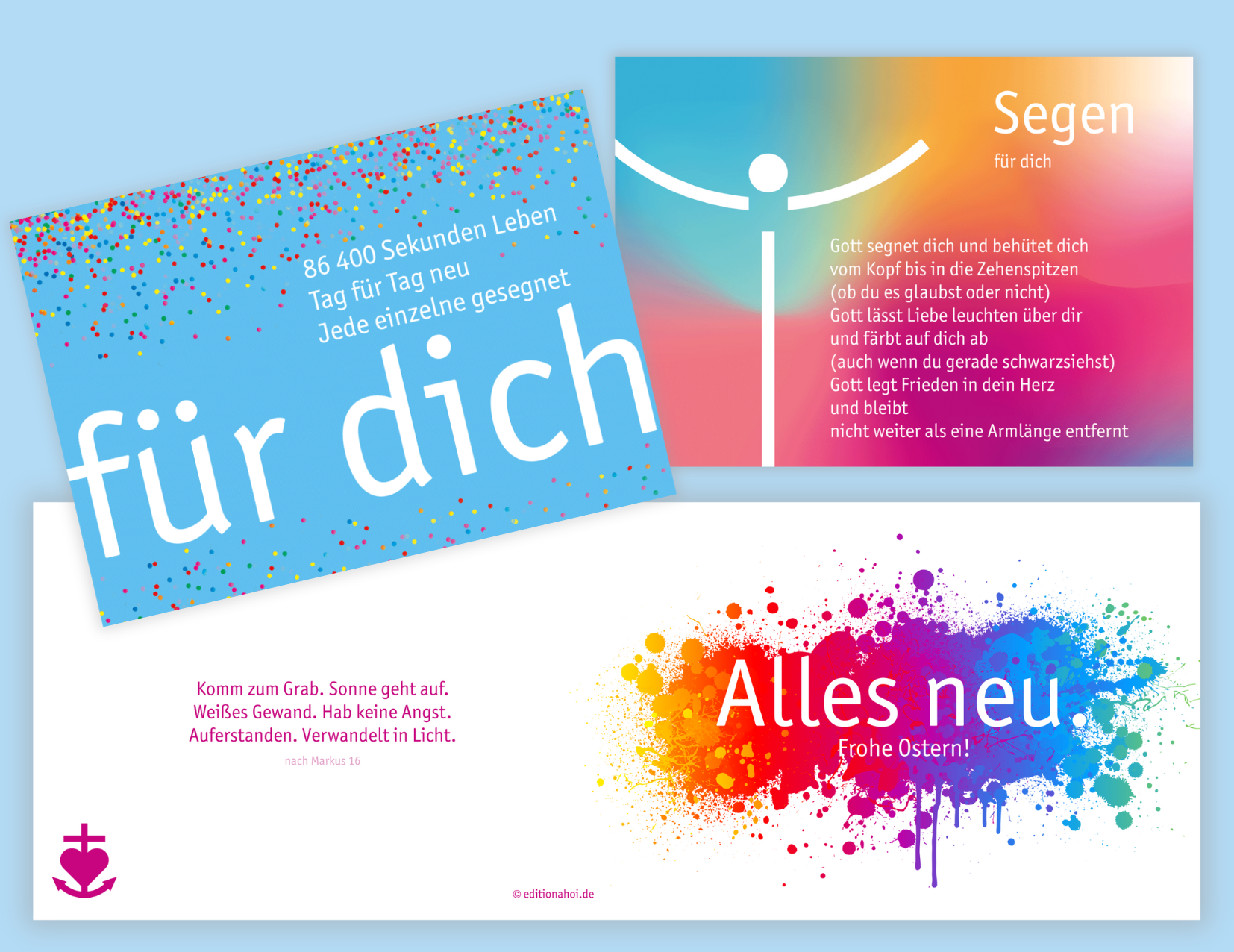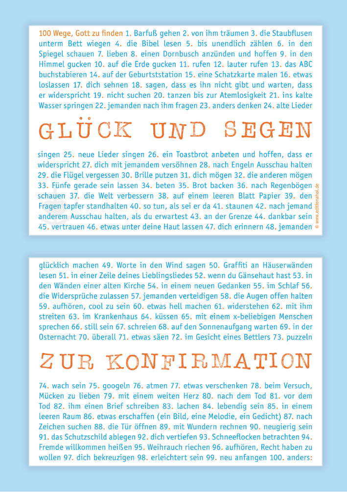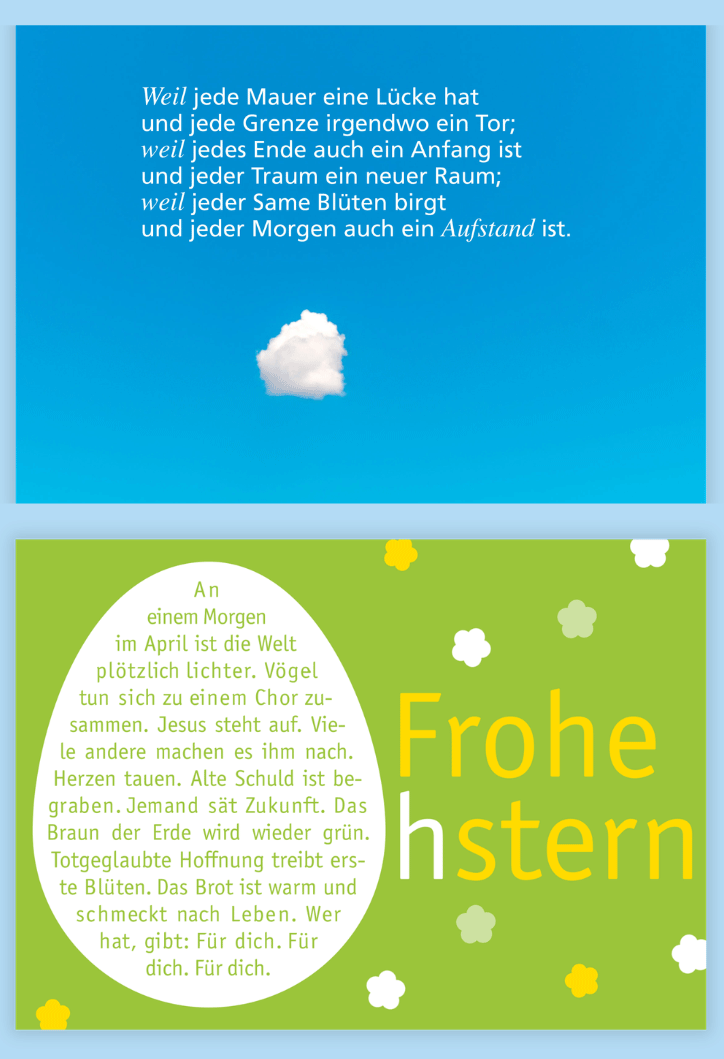 Wir mögen Postkarten. Irgendwas ist immer: Geburtstag oder Weihnachten. Konfirmation oder einfach ein leerer Briefkasten. Unsere Karten sind ein Gruß von unterwegs oder aus der Mittagspause. Ein Kopfhoch oder ein Werdwiedergesund. Ein Glückwunsch, ein Gottseidankdassesdichgibt. Schreib doch mal!