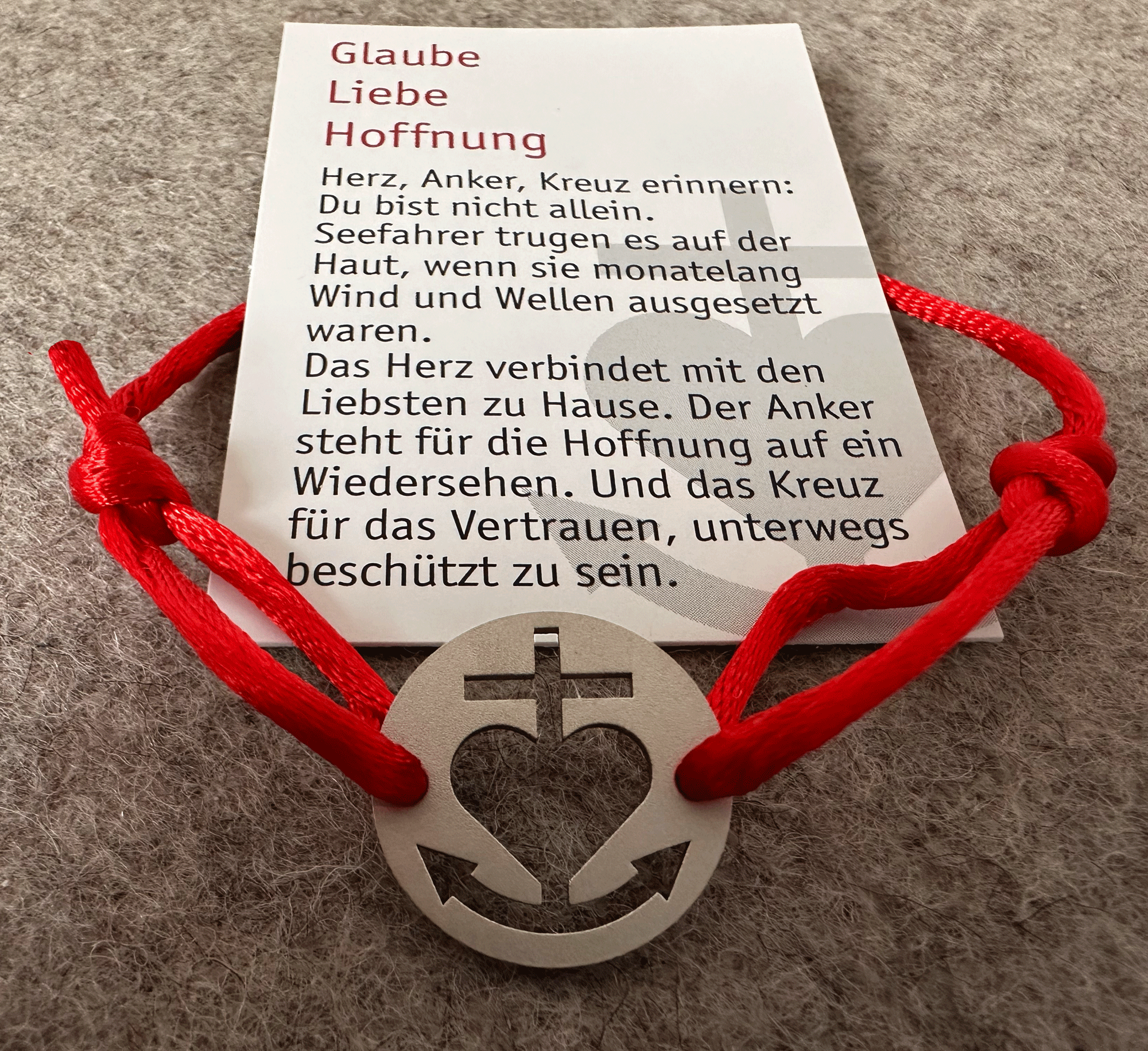 Er ist aus Edelstahl gefertigt, hat einen Durchmesser von 2 cm. Das Armband in schwarz oder rot lässt sich mit Schiebeknoten individuell einstellen . Das beiliegende Textheft ist eine kleine Versicherung für das, was im Alltag wirklich zählt: Was liebst Du? Woran glaubst Du? Worauf hoffst Du?