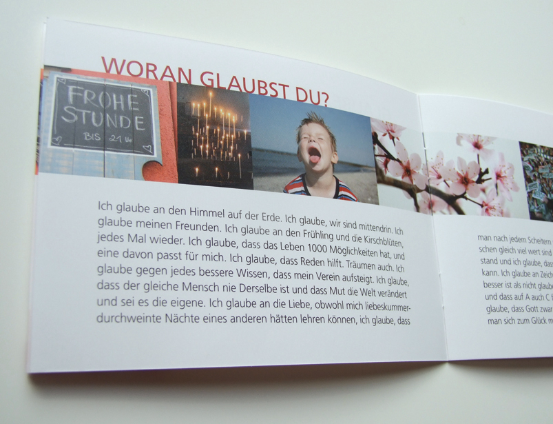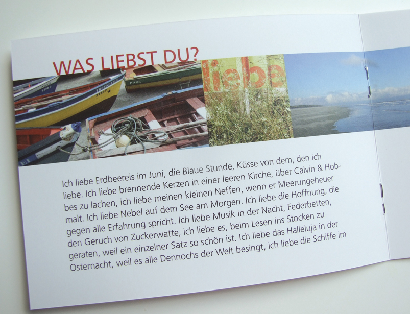 Das beiliegende Textheft macht Lust auf Leben: Es erinnert an das, was im Alltag wirklich zählt: Was liebst Du? Woran glaubst Du? Worauf hoffst Du?