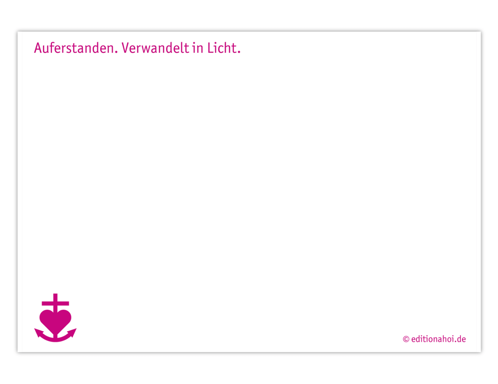 Die Postkarte hat eine leere Rückseite mit kurzem Satz am oberen Rand: Auferstanden. Verwandelt in Licht.