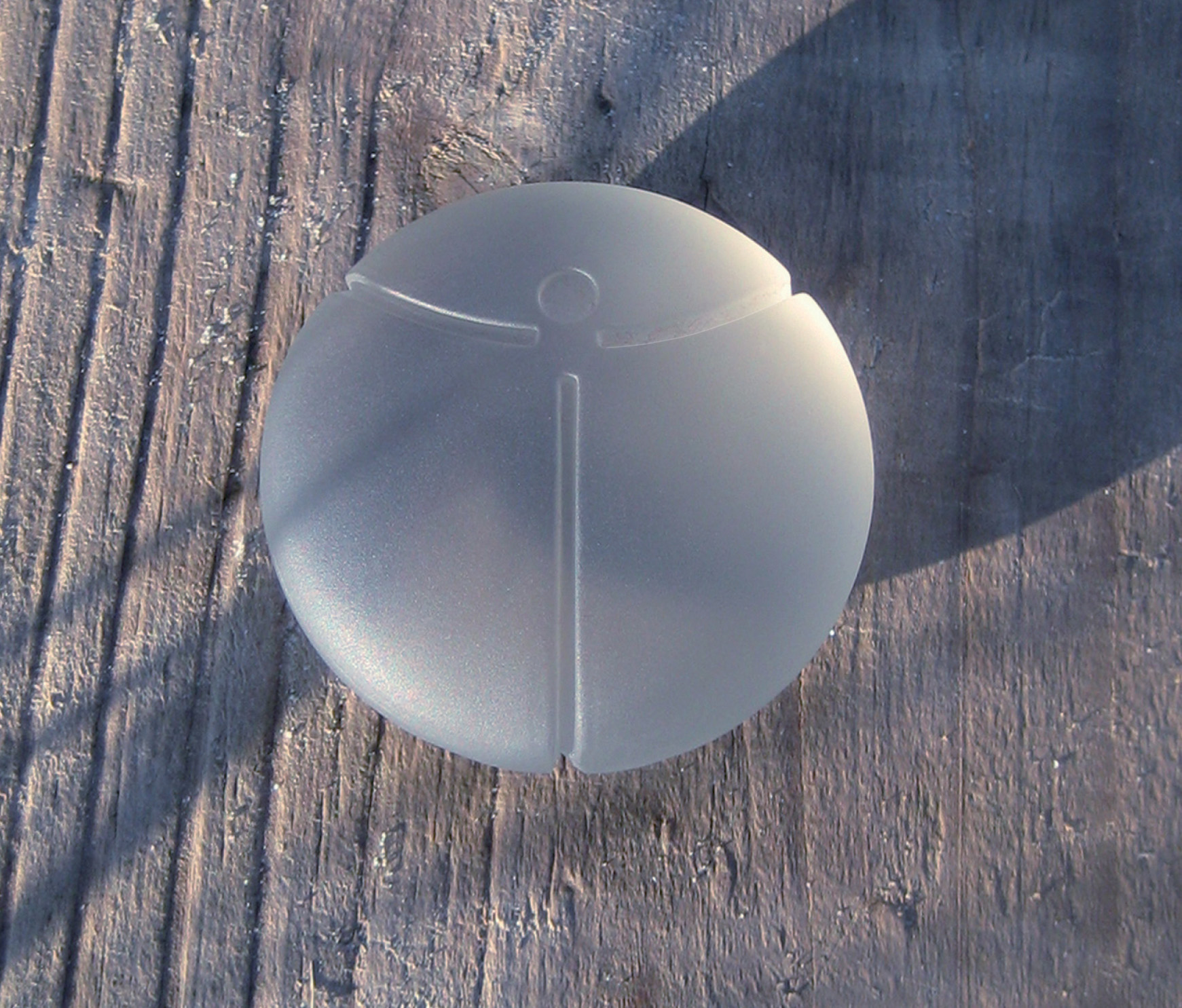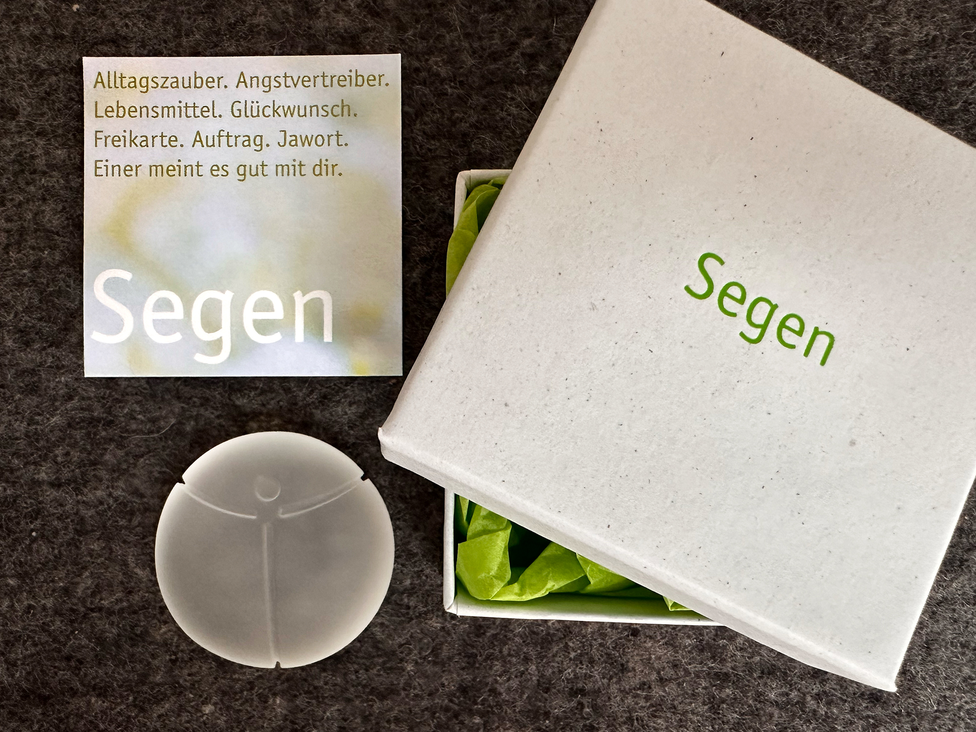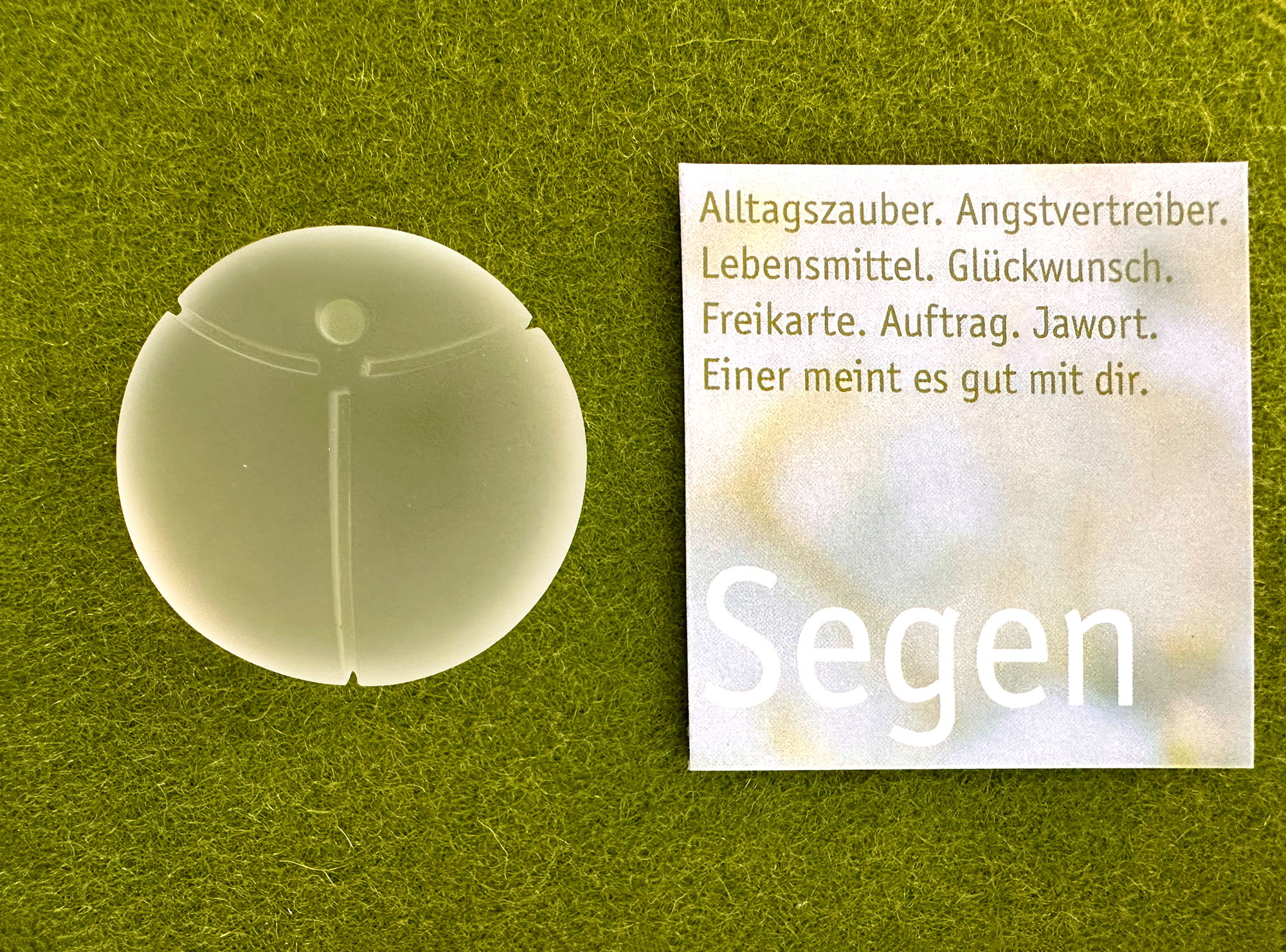Zum Festhalten oder Weitergeben: Der Segenskiesel ist ein weicher Handschmeichler aus satiniertem Glas. Er lässt das Licht durch, deshalb verändert sich seine Farbe je nach Untergrund. Von Hand gefertigt, hat er einen Durchmesser von 4 cm und ist 1,4 cm stark.